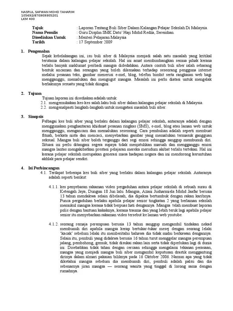 Kejadian kes buli secara tidak langsung telah menyukarkan mangsa untuk. 'buli' ialah perbuatan yang boleh mendatangkan trauma kepada manusia.pemangsa buli biasanya mempunyai perwatakan negatif dan berasal . Berikut adalah contoh karangan gejala buli di sekolah sebagai panduan dan rujukan .